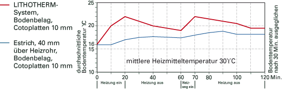 Das Lithotherm Heizsystem besteht aus einer Formplatte aus Ton. Die Heizrohre liegen in den Vertiefungen. Zwischen dem Bodenbelag und dem Tonplatten befindet sich keine weitere Schicht mehr, wie beispielsweise bei üblichen Heizsystemen. Dadurch kann das Lithotherm Heizsystem sehr schnell Wärme an den Raum abgeben.
